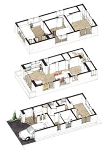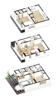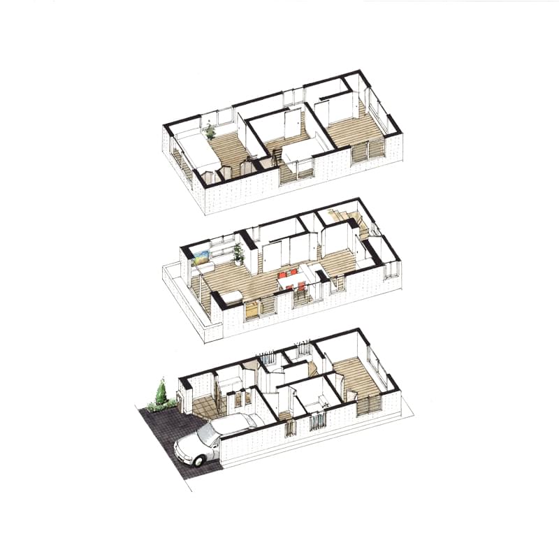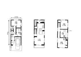 - 土地面積:約13坪、建物の間口が3.6mながら3LDK+トイレ2ヶを確保したプラン。